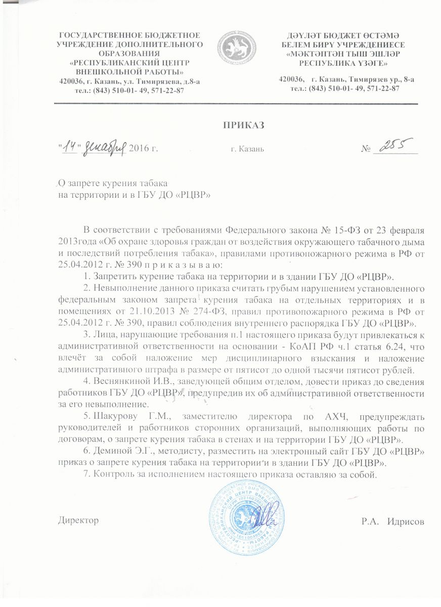 Приказ о запрете курения табака на территории и в ГБУ ДО "РЦВР"