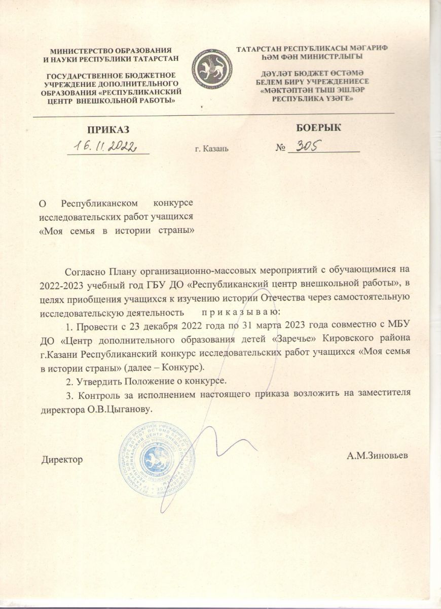 Приказ от 16.11.2022 №305 О проведении Республиканском конкурсе исследовательских работ учащихся "Моя семья в истории страны", Инф.письмо о проведении и Положение (23.12.2022-31.03.2023)