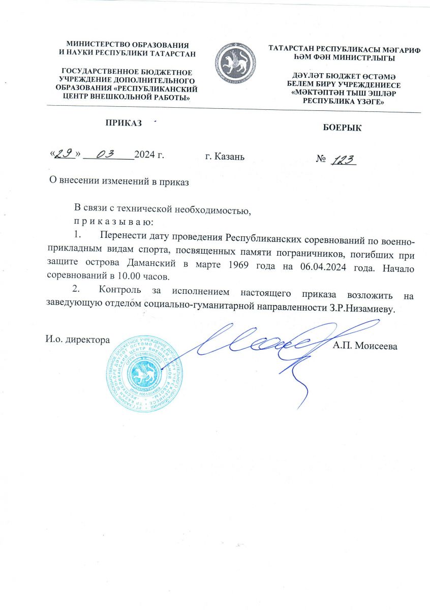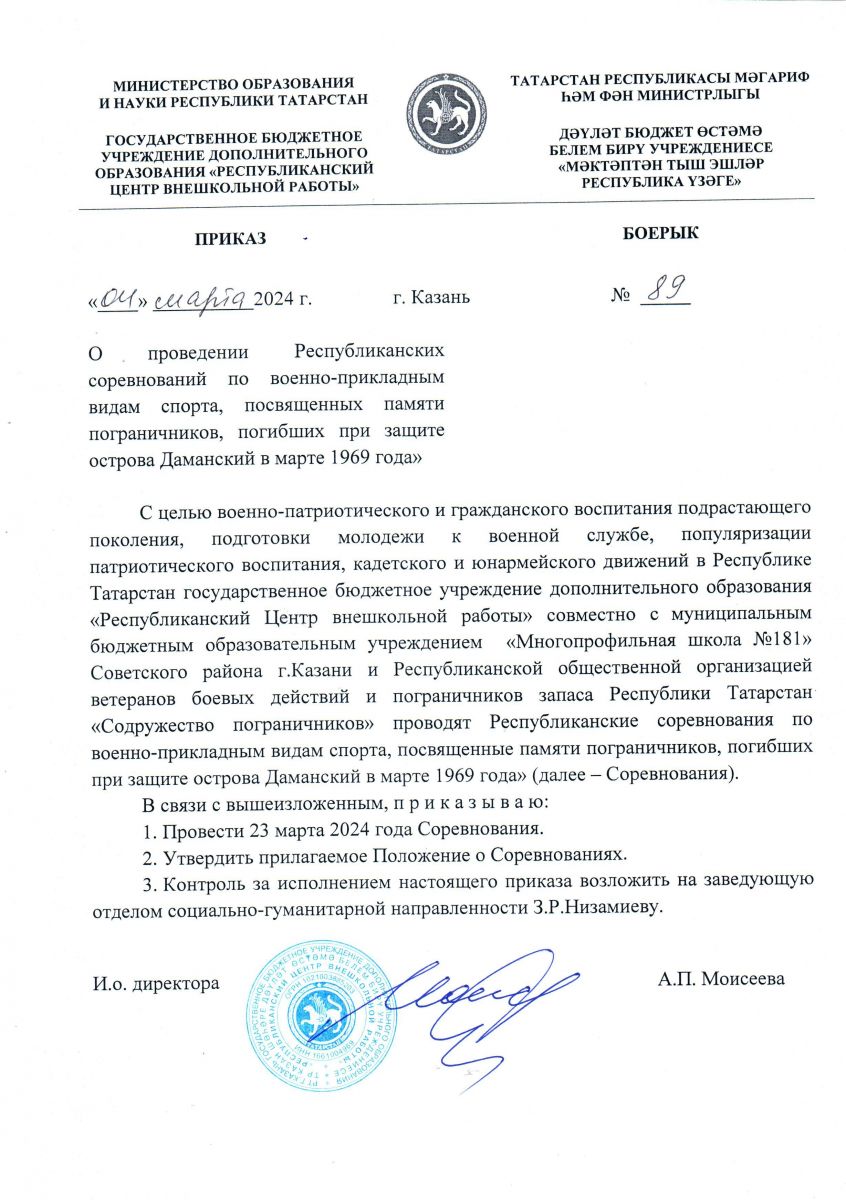Приказ от 29.03.24 №123 внесении изменений в Приказ от 04.03.2024 № 89 О проведении Республиканских соревнований по военно-прикладным видам спорта, посвященных памяти пограничников, погибших при защите острова Даманский в марте 1969 года, Положение соревнований (23.03.2024)