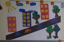 Воспитанники средней группы №6 выполнили коллективную работу "Мой город" - сказочный город. Целью которой была воспитывать у детей интерес к окружающему, развивать наблюдательность (передавать в аппликации различные по высоте дома, разрезать полоску, сложенную в несколько раз, для окон дома, располагать окна на одном уровне). Перед выполнением работы с детьми была проведена беседа о городе, о домах, какой формы дома, какого цвета. Была дана возможность высказаться каждому ребенку. Дети поделились своими мыслями и предложениями о том, какой бы они хотели видеть свой дом. Затем с детьми рассмотрели иллюстрации различных фасадов домов (многоэтажные дома, дома небоскребы, частные дома, дома-дачи). После приступили к коллективной работе: детям были даны на выбор геометрические фигуры разных цветов. Воспитатель в ходе работы помогал детям. В итоге вот такая работа у них получилась.