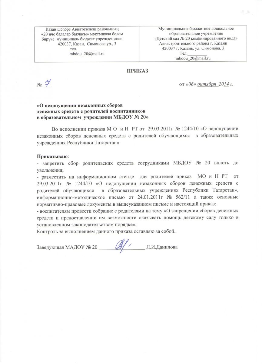 Приказ о недопущении сбора денежных средств