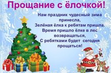 В завершении праздника дети прощаются с ёлкой до следующего Нового года: «До свидания, елочка, до будущей зимы, долго тебя, елочка будем помнить мы!» Новогодняя красавица, прощаясь с ребятами, гасит свои огни… -