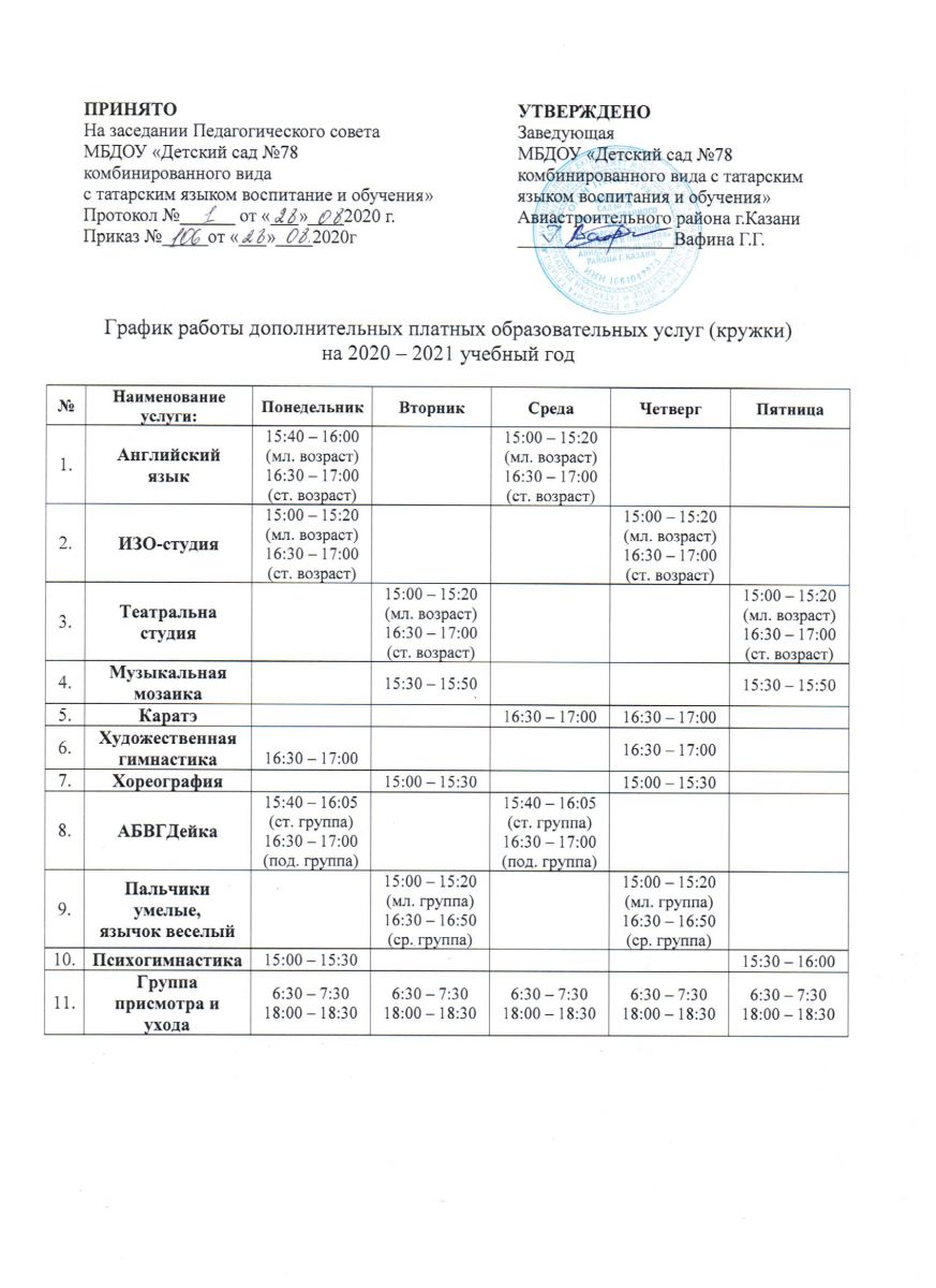 График оказания дополнительных образовательных и иных услуг на 2020-2021 учебный год