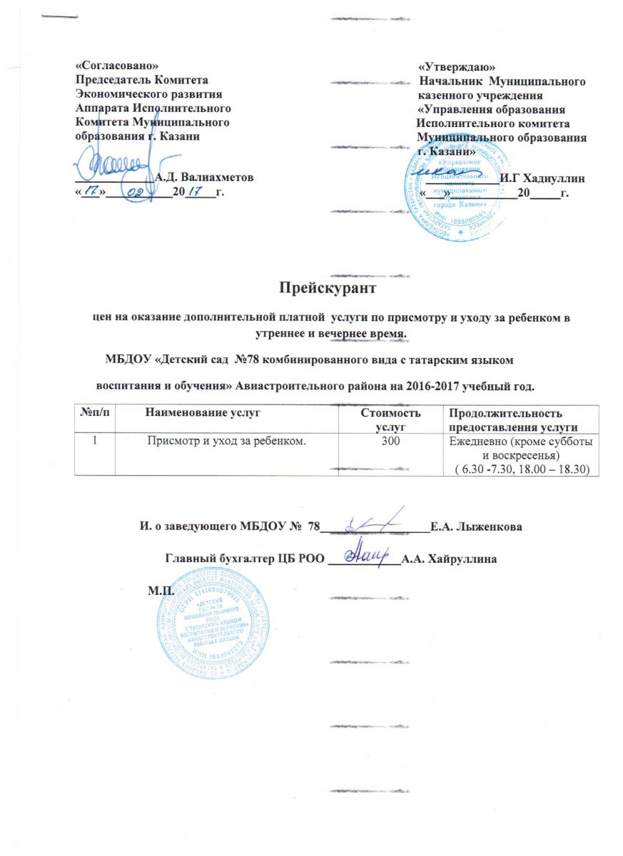 прейскурант цен на оказание плтной услуги по присмотру и уходу за ребенком