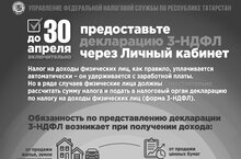 УФНС России по Республике Татарстан в рамках проведения ежегодной декларационной кампании и в целях информирования широкого круга лиц направляет для размещения в подведомственных организациях и для доведения до сотрудников учреждений листовку и баннер «До 30 апреля предоставьте декларацию 3-НДФЛ через Личный кабинет».