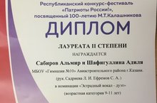 Ученик 4б класса Сабиров Альмир и ученица 3а класса Шафигуллина Адиля с руководителями Садриевой Л.И, Ефремовом С.А участвовали в республиканском конкурсе-фестивале "Патриоты России", где удачно выступив стали лауреатами 2 степени в номинации "Эстрадный вокал-дуэт". Поздравляем! Желаем дальнейших побед!