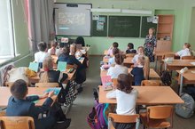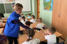 Ведущий специалист отдела профилактики ГБУ Безопасность дорожного движения Газизова Айгуль Зуфаровна и наш учитель физической культуры Эдуард Рустемович провели Посвящение в Юные пешеходы наших первоклассников!