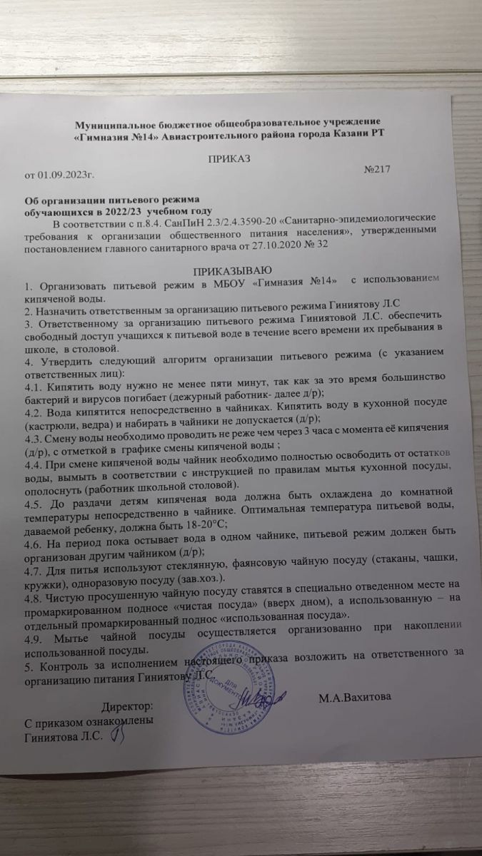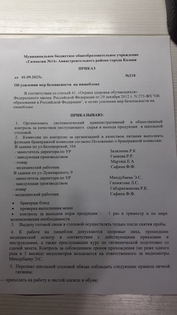 Приказ "Об усилении мер безопасности на пищеблоке"