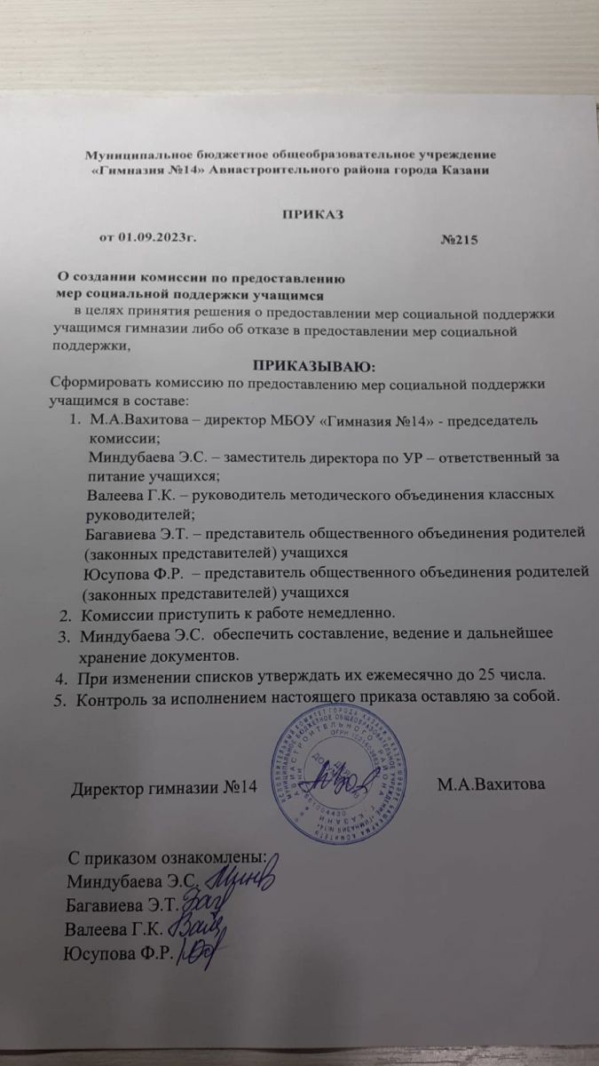Приказ "О создании комиссии по предоставлению бесплатного питания"