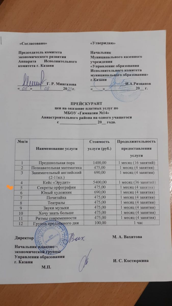 Прейскурант цен на оказание платных услуг 2023-2024 учебный год