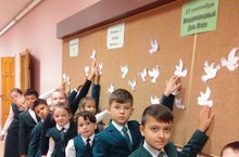 В Международный день мира ребята 3 В класса "выпустили" голубей в Добрый путь, как символ чистых помыслов и добрых намерений, написав имя пионера - героя Великой Отечественной Войны. Летите голуби,летите... Кл.руководитель: Чёрная Ольга Сергевна