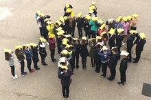 Ученики 7 и 8 классов устроили флешмоб "Мир во всем мире" под лозунгом "Мы- наследники Великой Победы!". Они изобразили живую фигуру в форме солнца,так как именно солнце- символ добра,надежды и мира.