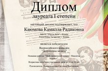 Каюмова Камилла, ученица 9Д класса, принимала участие во Всероссийском конкурсе, посвященном 75-летию Победы в Великой Отечественной войне, «Дедушкины медали» и получила Диплом Лауреата I степени (учитель Красильникова С.В.). Название работы «Мой героический прадед – Мавлетов Махмут». Поздравляем!