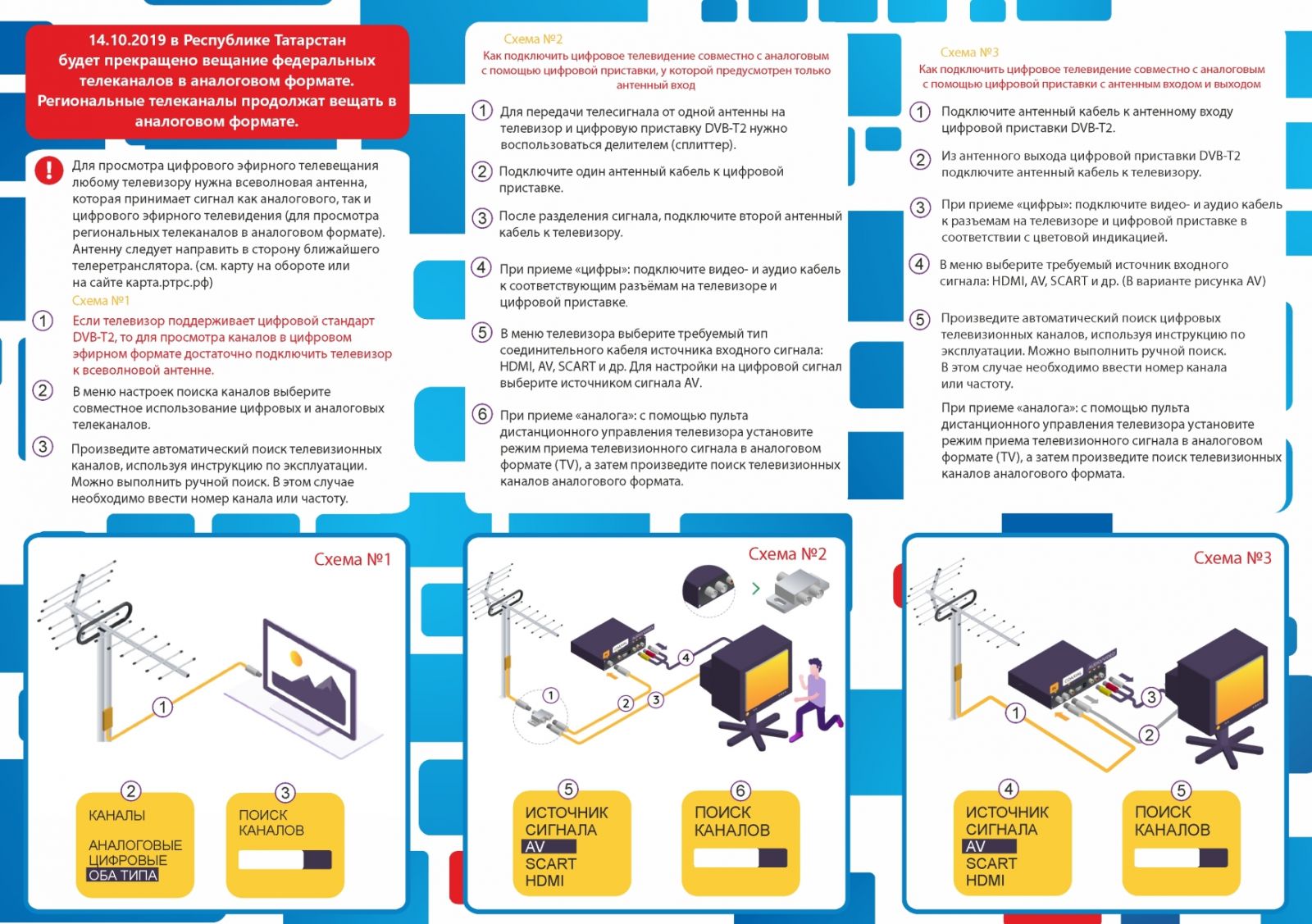 14 октября 2019 года в Республике Татарстан предстоит полномасштабный переход на цифровое телевещание, в рамках которого будет отключено аналоговое эфирное телевещание. Пошаговая инструкция настройки приема цифрового эфирного телевидения по ссылке: Лист 1., Лист 2., Лист 3.