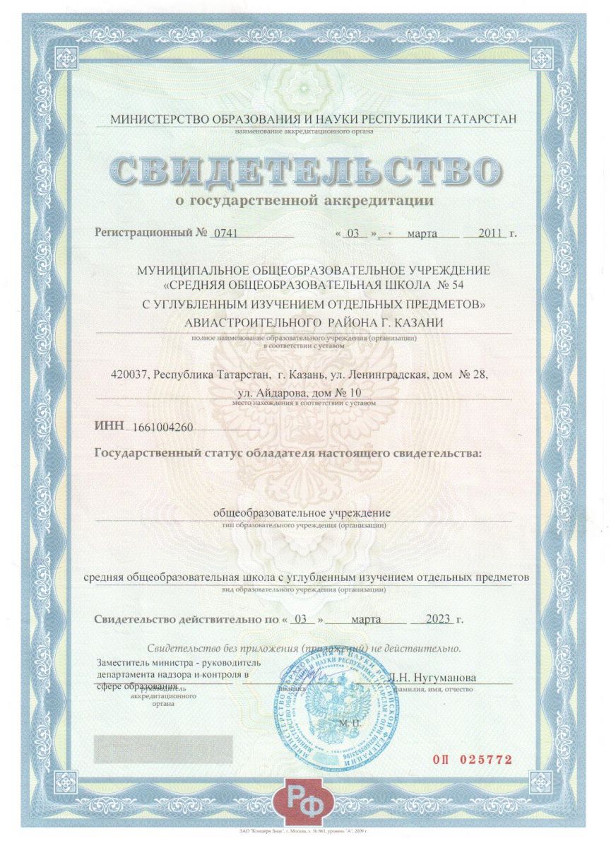 Муниципальное бюджетное общеобразовательное учреждение "Средняя общеобразовательная школа № 54 с углубленным изучением отдельных предметов" Авиастроительного района г. Казани/Казан шәһәре Авиатөзелеш районының "Аерым предметлар тирәнтен өйрәнелә торган 54 нче урта гомуми белем бирү мәктәбе" гомуми белем муниципаль бюджет учреждениесе