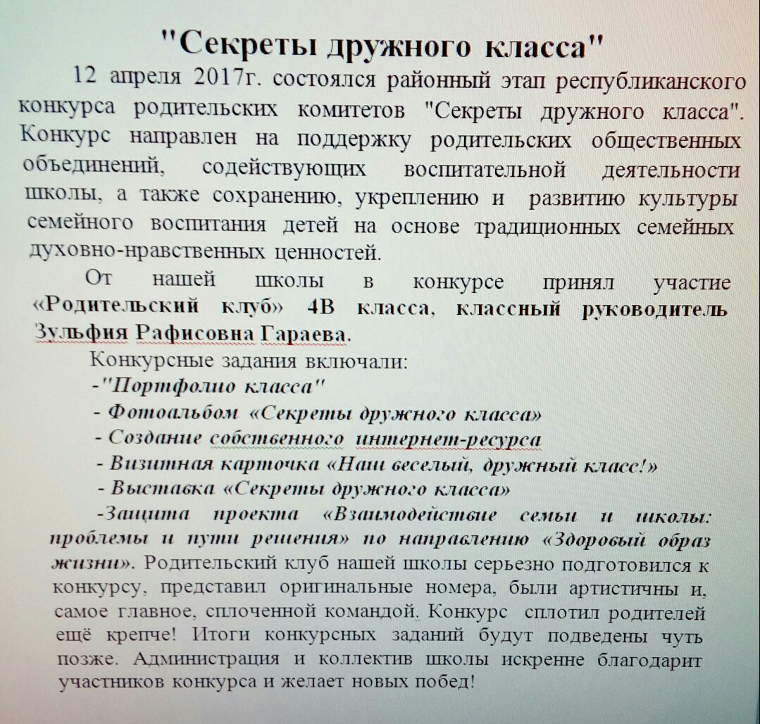 участникам районного этап республиканского конкурса родительских комитетов "Секреты дружного класса".