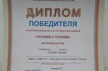 20 октября 2017г. на базе МБУДО "Городсой центр творческого развития и гуманитарного образования для одаренных детей г.Казани" состоялась открытая олимпиада для младших школьников "Техника чтения". Под руководством Елены евгеньевны савиной в данной олимпиаде принял участие ученик 3 класса "Б" Саляев Алмачс и стал победителем. Молодец!!!Поздравляем!!! 20.10.2017