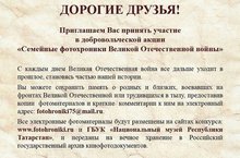 "Семейные фотохроники" в Татарстане. В Татарстане продолжается сбор частных фотоархивов времен Великой Отечественной войны. Напомним: электронный архив с краткими комментариями о наших земляках и событиях военного периода будет передан на вечное хранение в Национальный музей РТ. В рамках подготовки к 75-летию Победы в республике объявлен конкурс «Семейные фотохроники Великой Отечественной войны» по сбору фотоматериалов из семейных архивов, посвященных землякам, воевавшим на фронте и трудившимся в тылу.Часть собранных татарстанцами фотокопий и документов были использованы в прошлом году 9 Мая при прохождении «Бессмертного полка» в городах и районах республики.Всего за два предыдущих года собрано более трех с половиной тысяч фотографий. По итогам всероссийского конкурса «Семейные фотохроники великих войн России» Татарстан был признан победителем среди регионов. Позднее к акции подключились районные советы ветеранов, республиканские предприятия и министерства. Новый этап акции «Семейные фотохроники» приурочен к 75-¬летию Великой Победы. Для того чтобы принять в ней участие, необходимо посетить интернет-¬сайт www.fotohroniki.ru – там размещены условия, алгоритм и сроки подачи документов, другие необходимые сведения Ребята приносят фотографии своих бабушек и дедушек – участников Великой Отечественной войны, их ордена и медали, документы. Фотографии сканируются и позднее размещаются на сайте. Разместить подобные материалы здесь самостоятельно может и любой желающий. «Мы поставили перед собой задачу – достучаться до каждой семьи, чтобы максимально пополнить архив. С сентября до конца апреля проходит этап конкурса нынешнего года, на следующий год с сентября по апрель пройдет конкурс следующего сезона, и так – вплоть до 75-¬летия Победы. К тому сроку планируем сформировать основной банк военных фотографий. Если участник акции сам не может отсканировать материалы, то может обратиться в ближайшую школу, где ему помогут это сделать. Первоначально собранные документы будут отправлены в районные центры детского творчества. Затем отформатированные материалы передадут в Москву и в Национальный музей РТ. В конкурсе могут принять участие все жители Татарстана, у которых имеются фотографии, фотоматериалы, фотодокументы личных и семейных архивов военных лет, а также желающие включиться в добровольческую работу по сохранению памяти о войне. Цель акции – увековечение памяти о фронтовиках и тружениках тыла, патриотическое воспитание молодежи, вовлечение учащихся, учителей и преподавателей образовательных организаций в добровольческую работу. В Татарстане конкурс «Семейные фотохроники» проводится по следующим номинациям: • на лучший электронный архив фотографий времен Великой Отечественной войны – в данной номинации участвуют ветеранские организации муниципальных городов и районов, образовательные учреждения, внесшие значительный вклад в реализацию конкурса «О проведении акции «Семейные фотохроники Великой Отечественной войны» в рамках подготовки к 75-¬летию Победы; • на лучшую фотовыставку «О проведении акции «Семейные фотохроники Великой Отечественной войны» в рамках подготовки к 75¬-летию Победы» – в данной номинации будут оцениваться представленные материалы о проведении выставок в общеобразовательных орган