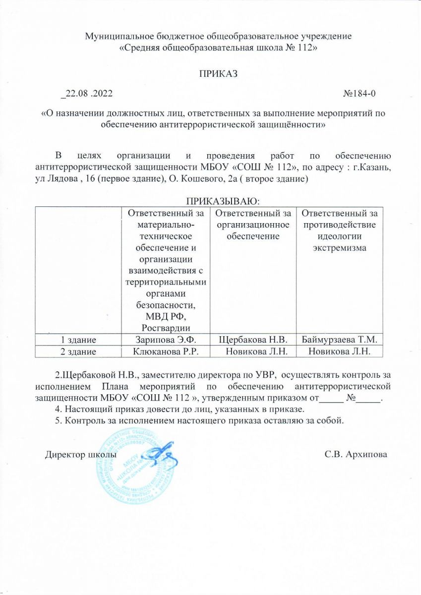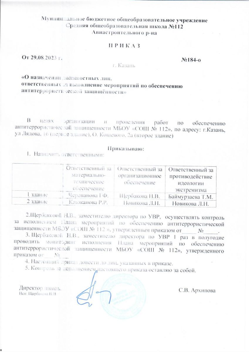Приказ "О мероприятиях по обеспечению антитеррористической защищенности" №184-О от 01.09.2021г.