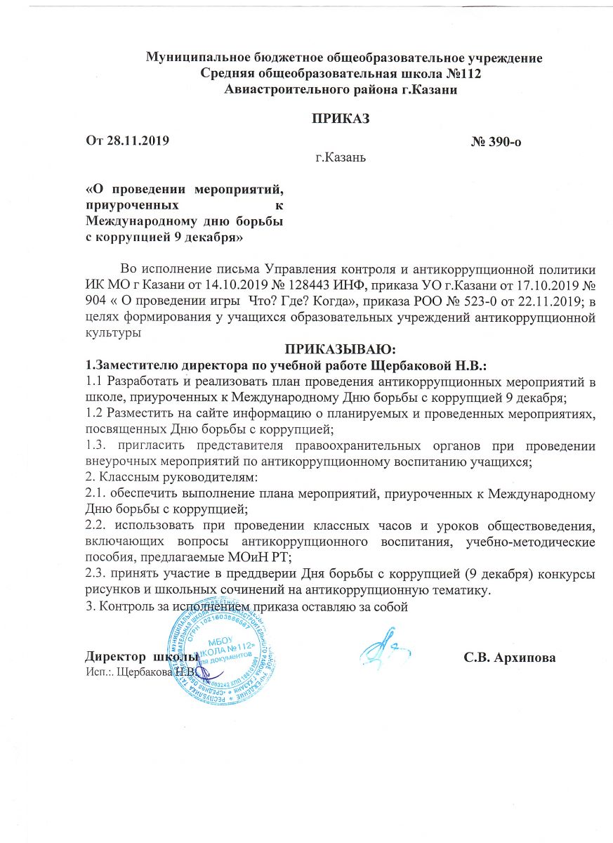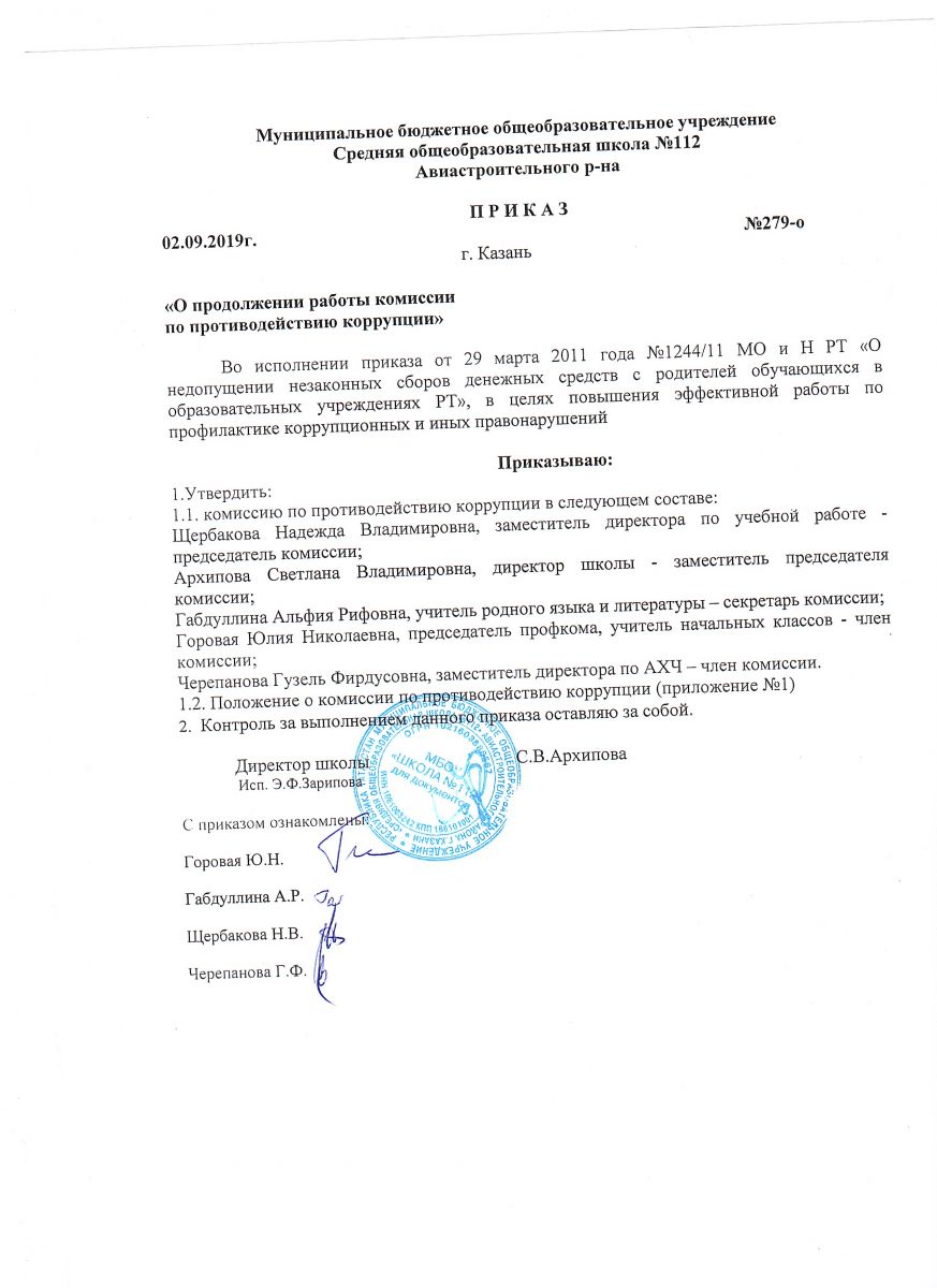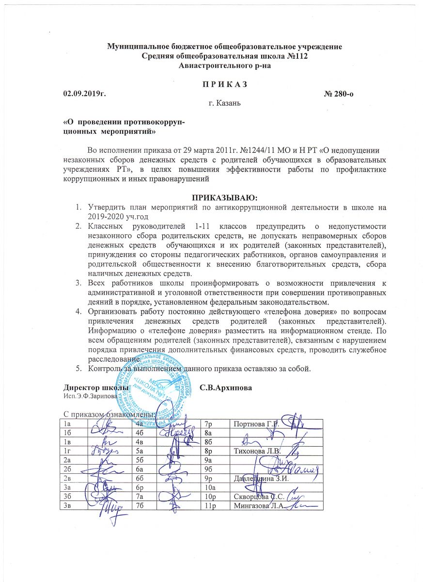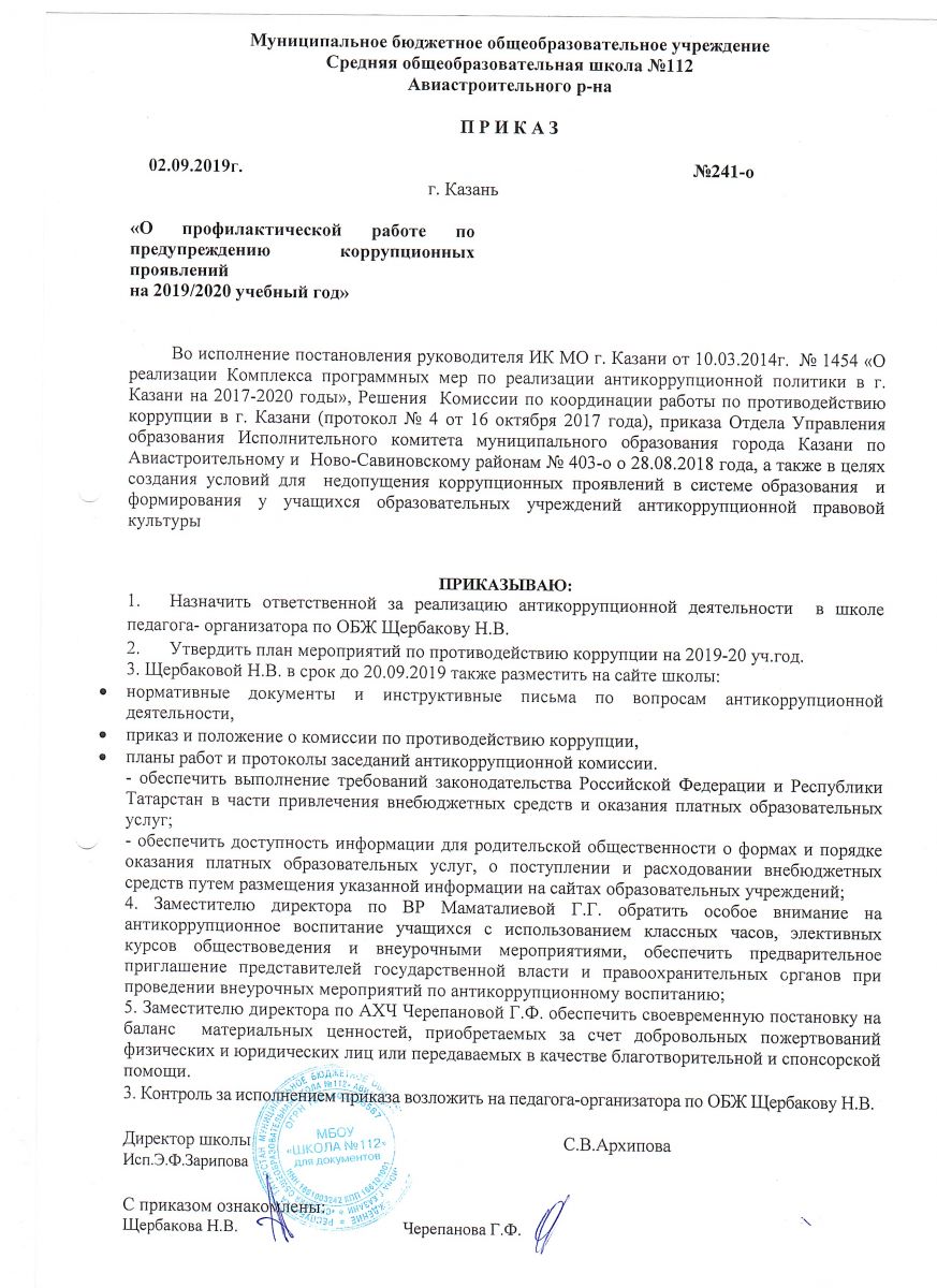 Приказ о проведении противокоррупционных мероприятий 02.09.2019г.