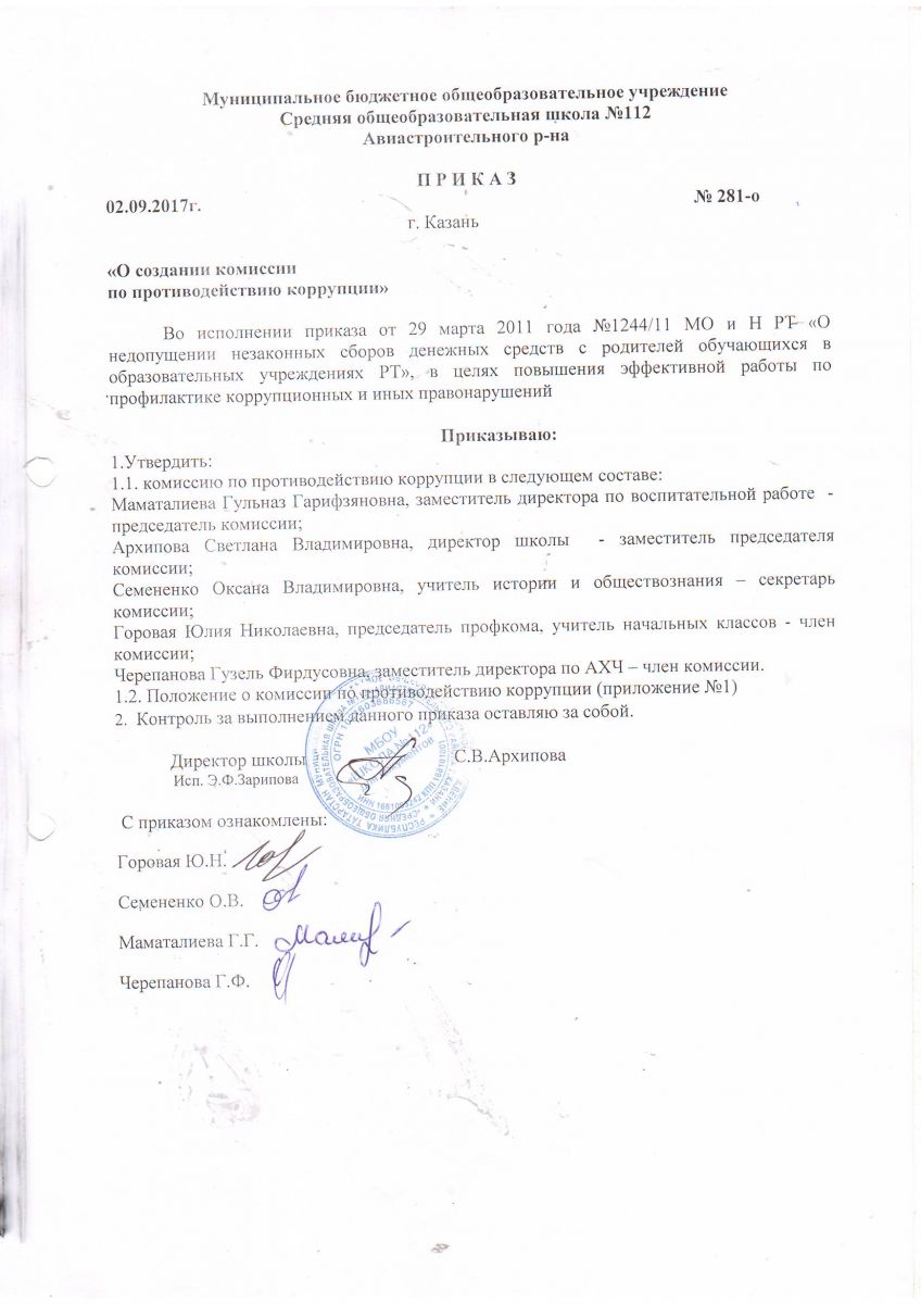 Приказ о создании антикоррупционной комиссии в 2017/2018 учебном году