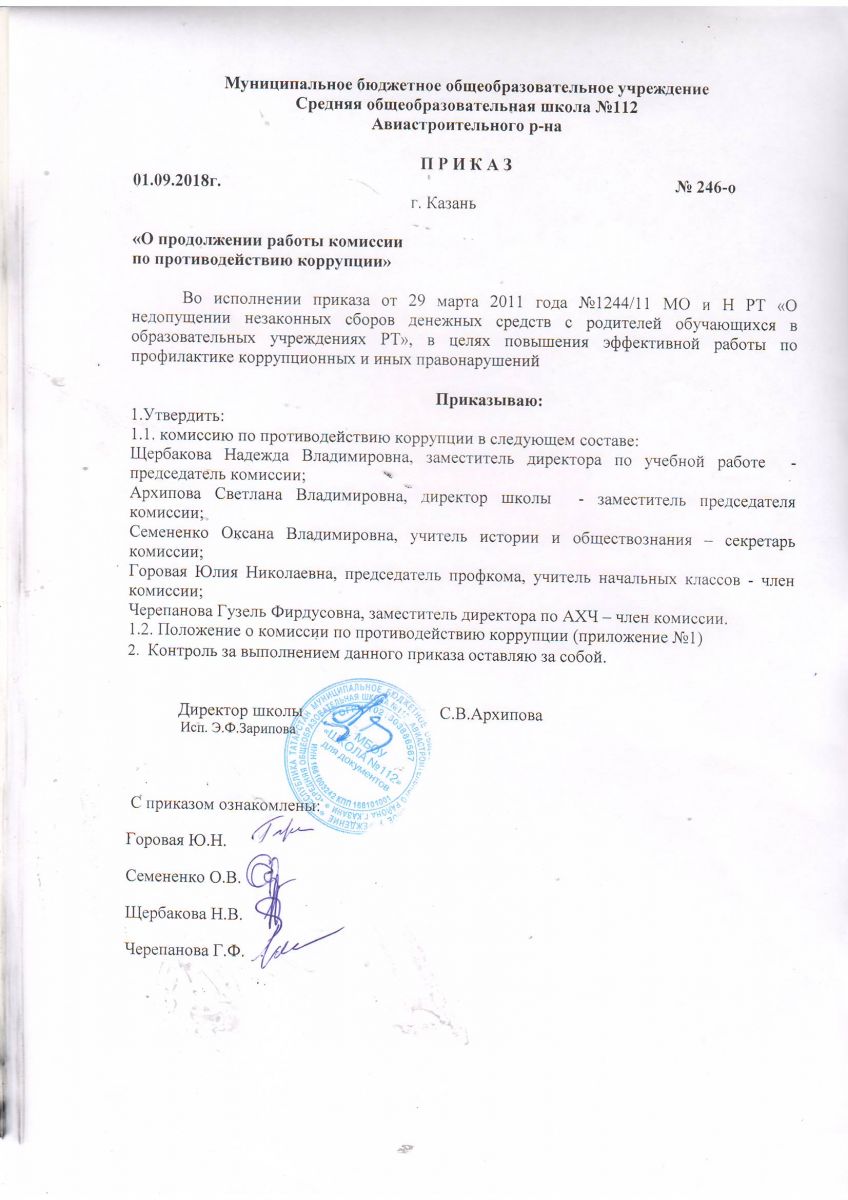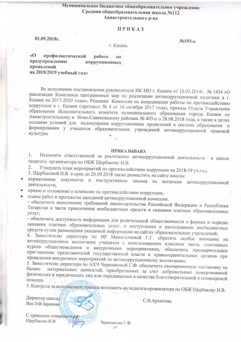 Приказ по профилактике антикоррупционных проявлений от 1.09.2018г.