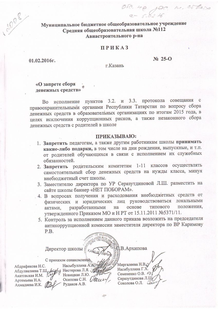 Приказ о запрете сбора денежных средств
