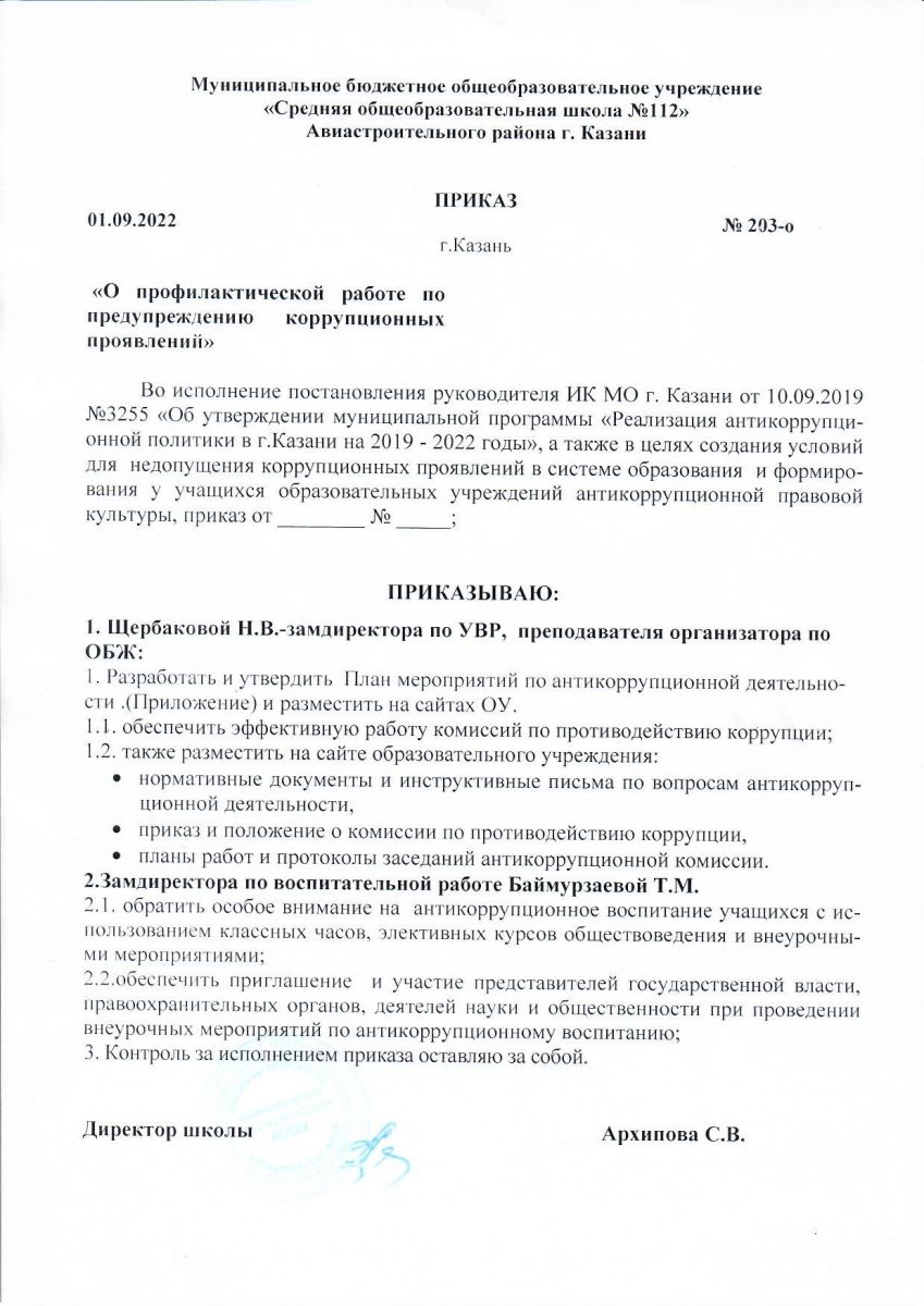 Приказ о прфилактической работе по предупреждению коррупционных проявлений № 203-о от 1.09. 2022г.