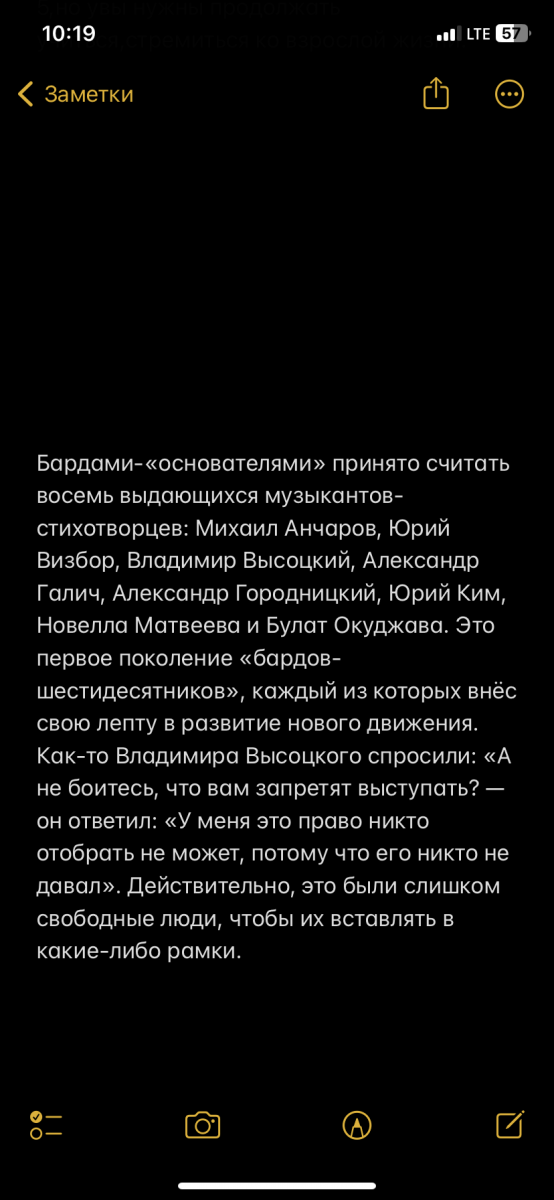 Сегодня на уроке литературы мы проходили поэтов 60-х годов. Представителями были такие известные личности как Высоцкий, Визбор, Окуджава и Виктор Цой. Мы слушали их музыкальные произведения, чтобы проникнуть в глубокий смысл текстов. не зря, спустя столько времени, люди помнят таких талантливых людей. Их композиции ассоциируются у меня с дворовыми песнями; они очень простые, но с очень важным посылом.