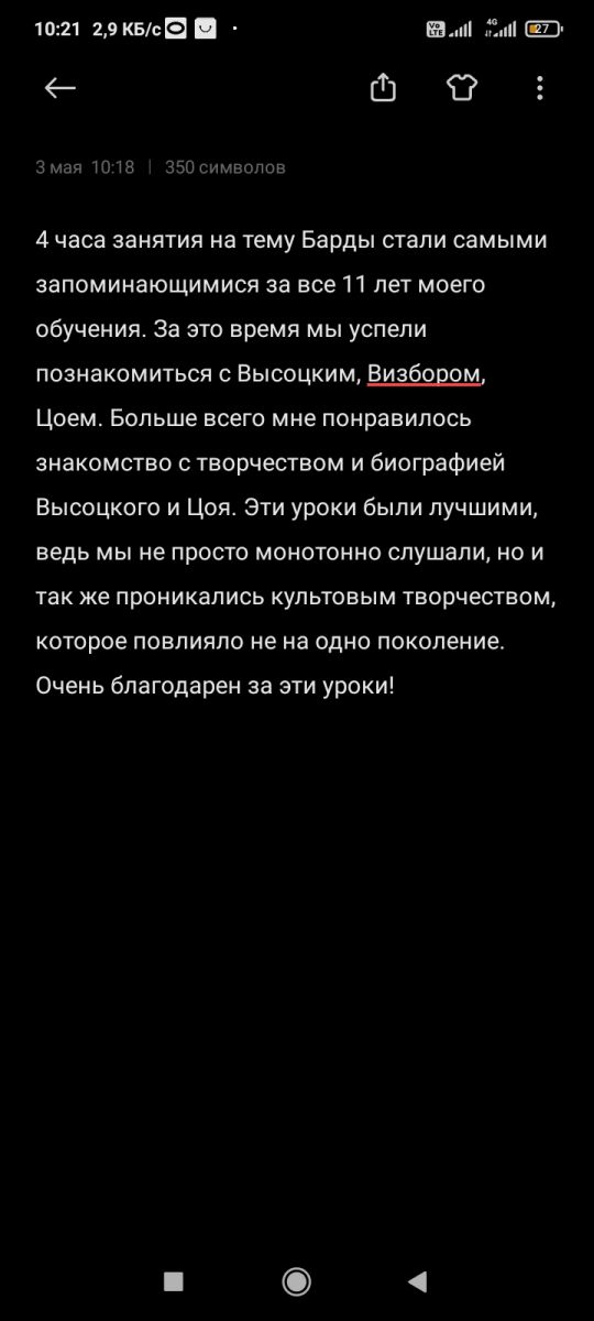 За 2 часа я узнал очень много, чего я бы не узнал за неделю.Мы слушали песни, стихи всех композиторов, узнали очень много нового и интересного. Спасибо большое за такие замечательные 2 часа нашей Ларисе Викторовне, если бы не она, мы бы ,мне кажется, никогда не узнали кто такие барды, не узнали бы историю их жизни и текстов
