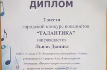Поздравляем Львова Даниила, ученика 1а класса, который занял 2 место в городском конкурсе вокалистов "Талантика", в номинации "Военно-патриотическая песня". Руководитель Сутырова Алла Александровна.