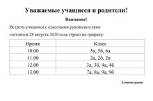 Уважаемые родители и законные представители наших первоклассников!!! 25.08.2020 г. в 17:00 состоится встреча родителей первоклассников с классными руководителями!