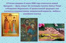 В память о святых супругах Петре и Февронии Муромских с 2008 года 8 июля мы отмечаем Всероссийский день семьи, любви и верности.