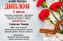 Поздравляем Сабитова Тимура, который занял 1 место в республиканском конкурсе творческих работ "Салют победы"! Номинация: декоративно-прикладное творчество "Нам жить и помнить!"