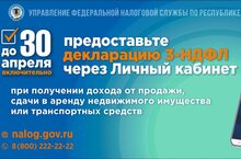 УФНС России по Республике Татарстан проводит ежегодную декларационную кампанию "До 30 апреля представьте декларацию 3-НДФЛ через Личный кабинет".