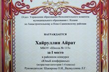 Поздравляем Хайруллина Айрата, ученика 4 А класса (классный руководитель Шакирова О.И.). Айрат принял участие в районном конкурсе "Юный конферансье" и занял 1 место (возрастная категория 1-4 классы).