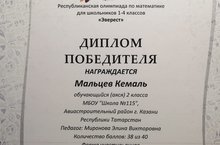 Поздравляем ученика 2 А класса Мальцева Кемаля (классный руководитель Миронова Э.В.), ставшего победителем в очной Республиканской олимпиаде по математике "Эверест".