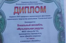 Вокальный ансамбль "Музыкальная радуга" МБОУ "Школа №115" (руководитель Сергеева И.А.) принял участие в XVII городском экологическом фестивале сценического творчества школьников "Солнечный мост" и занял 2 место в номинации "Ансамбль" с песней "Давайте сохраним". Поздравляем!