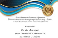 Поздравляем Сычёва Алексея, ученика 2а класса, занявшего 3-е место в районной викторине по произведениям Н.Н.Носова, посвящённой 115-летию со дня рождения пистателя, среди учащихся 2-х классов. Руководитель Дикмарова Л.Н.