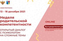 О проведении «Недели родительской компетентности» с 13 по 18 декабря 2021 г. 13-18 декабря состоится Неделя родительской компетентности: открытый диалог с психологом на сложные темы. Регистрация: Бытьродителем.рф