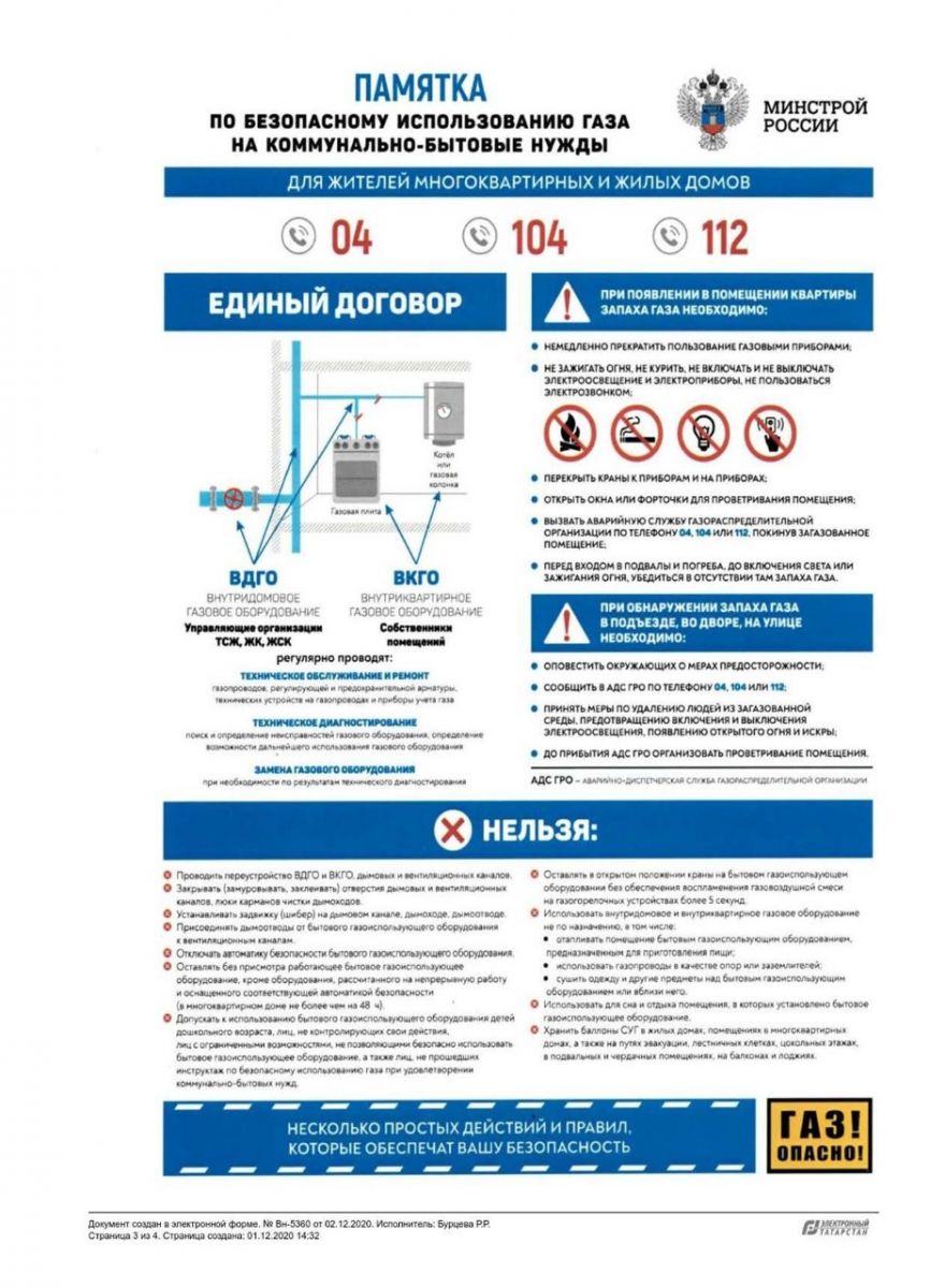Памятка по безопасному использованию газа на коммунально-бытовые нужды 18.12.2020