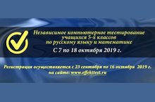 Регистрация общеобразовательных организаций для участия школьников 5-х классов в независимом компьютерном тестировании по русскому языку и математике осуществляется с 23 сентября по 16 октября 2019 г.