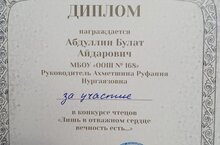 Поздравляем обучающихся 5 класса Абдуллина Булата и Шамсетдинову Дилию, награжденных Дипломами за участие в Городском конкурсе чтецов «Лишь в отважном сердце вечность есть» 9 декабря 2022 года, который прошел в Литературном музее Габдуллы Тукая. Администрация школы благодарит педагогов, подготовивших участников конкурса, Ахметшину Руфанию Нургаязовну и Забелину Надежду Николаевну.