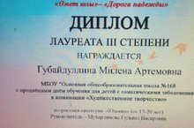 Поздравляем призера и участника республиканского конкурса «Өмет юлы»- «Дорога надежды» Губайдуллину Милену, лауреата 3-ей степени, и Туюрову Милену, награжденную дипломом участника. Администрация школы благодарит за подготовку призера и участника учителя родного языка и литературы Мухарлямову Гульназ Насировну.