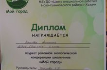 Поздравляем ученицу 6 класса МБОУ «ООШ № 168» Герасеву Тоню, лауреата районной экологической конференции «Мой город»! Администрация школы благодарит за подготовку лауреата конференции учителя биологии и географии Шишову Эльмиру Ришатовну.