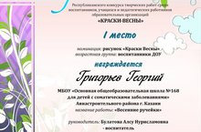 Поздравляем воспитанника дошкольного отделения МБОУ «ООШ № 168» Григорьева Георгия, занявшего первое место в республиканском конкурсе творческих работ воспитанников, учащихся и педагогических работников образовательных организаций «КРАСКИ-ВЕСНЫ».