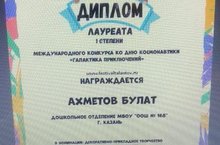 Поздравляем воспитанника дошкольного отделения МБОУ «ООШ № 168» Ахметова Булата, лауреата 1 степени международного конкурса ко Дню космонавтики «Галактика приключений». Администрация школы благодарит воспитателя подготовительной группы №3 Тимирбаеву Гульфину Абдрахмановну за подготовку победителя конкурса.