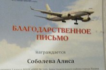 Ученица 1 класса Соболева Алиса приняла активное участие в конкурсе рисунков, презентаций, стихов «Казанский авиационный завод. Люди, судьбы» в номинации «Лучшее стихотворение среди учащихся 1-11 классов», получила благодарственное письмо и подарки.