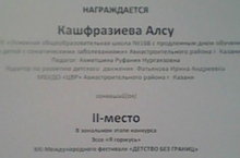 Поздравляем учеников школы №168 Кашфразиеву Алсу и Берендеева Никиту, ставших призерами в зональном этапе конкурсов Эссе «Я горжусь» и «Добрый волшебник» в рамках XXI Международного фестиваля «Детство без границ». Администрация школы выражает благодарность за подготовку призеров учителю русского языка и литературы Ахметшиной Р.Н. и учителю родного языка и литературы Валиевой Л.Н.