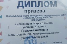 Поздравляем ученика 5 класса МБОУ «ООШ № 168» Соболева Антона, ставшего призером в городской научно-практической конференции «Старт в науку»! Благодарим учителя биологии Шишову Э.Р. за подготовку призера!